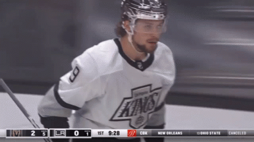 Adrian Kempe celebrates after scoring a goal for the LA Kings during a hockey game.