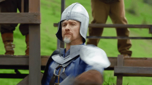 A man in a knight's helmet and armor shouts '¡La Ley Es La Ley!' (The Law Is The Law!).