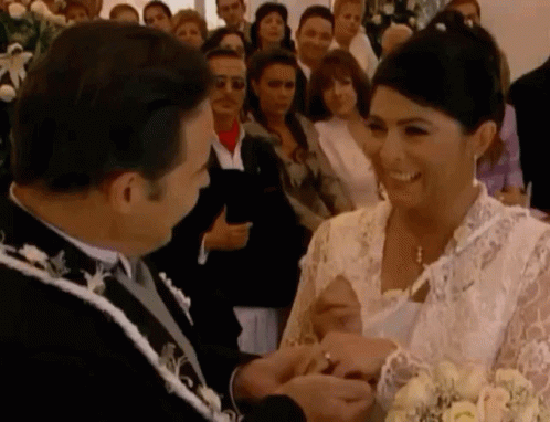 Maria and Esteban's wedding day from La Madrastra, with Cesar Evora placing a ring on Victoria Ruffo's finger.