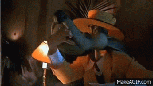The Mask character transforms into a wolf-like creature, whistling in a dimly lit room.