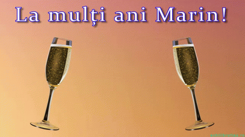 A festive animated greeting card wishing 'Happy Birthday Marin!' with two clinking champagne glasses.