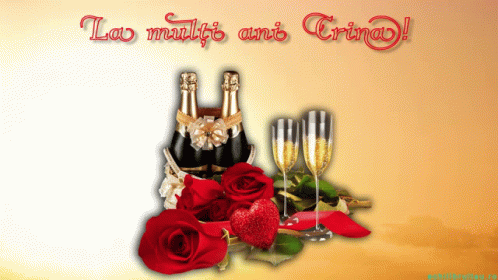 A festive greeting card for Crina, featuring champagne bottles, flutes, and red roses.
