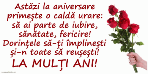 A heartfelt Romanian birthday greeting with wishes for love, health, and happiness, accompanied by red roses.