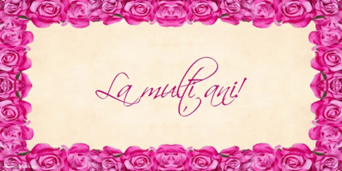 A beautiful card with a pink rose border wishing 'La multi ani' (Happy Birthday) in elegant script.