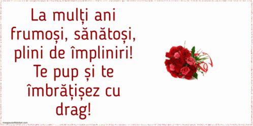 A beautiful bouquet of red and pink roses accompanies a heartfelt Romanian 'Happy Birthday' message.