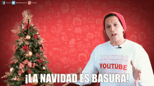 Man in a YouTube shirt declares 'Christmas is Trash!' next to a decorated Christmas tree.