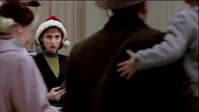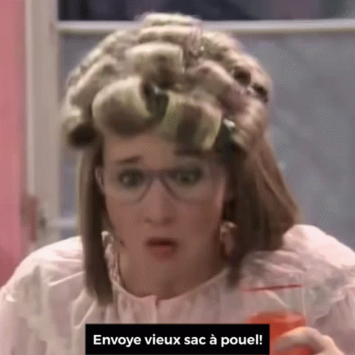Thérèse Paré from La Petite Vie, with curlers in her hair, delivers her iconic line: "Envoye vieux sac à pouel!"