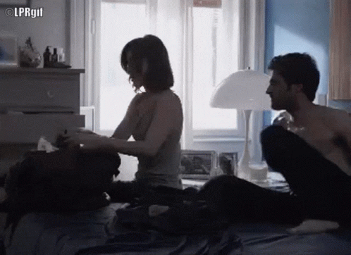 Anna Mayer and Leonardo Cagliostro share an intimate moment on a bed in 'La Porta Rossa'.