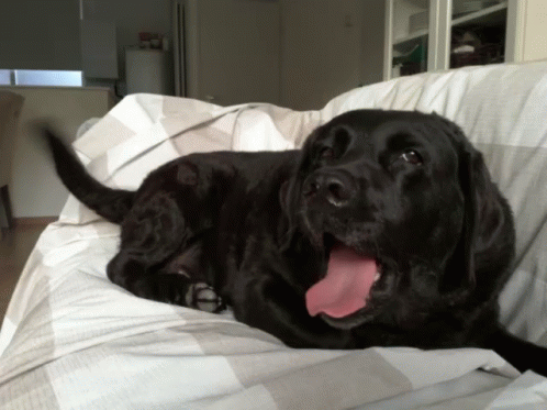 A happy black Labrador dog is comfortably chilling on a couch with its tongue slightly out.