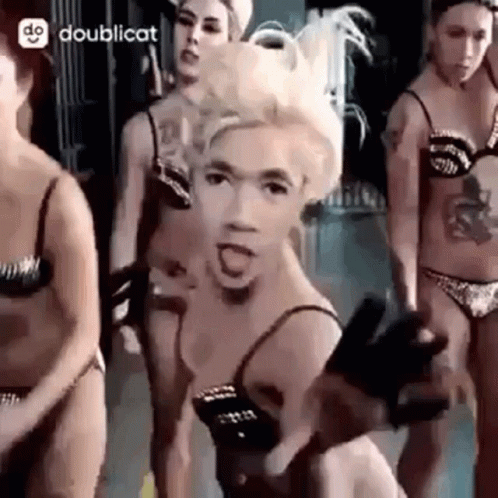 Lady Beth performs a face morph dance with a group of women in bikinis, showcasing energetic movements.
