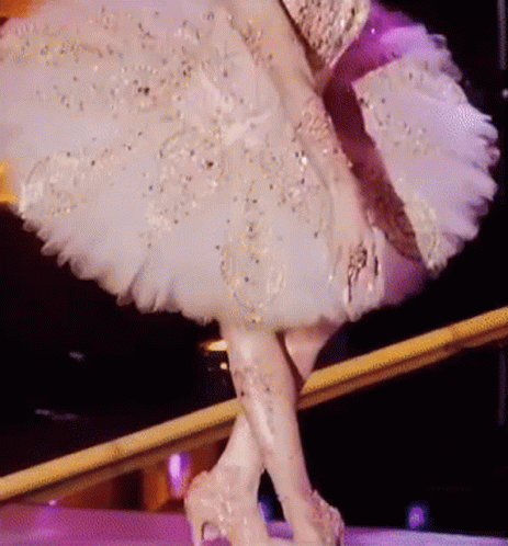 Lady Camden performs in a stunning white and gold ballerina tutu and corset, showcasing her Drag Race look.