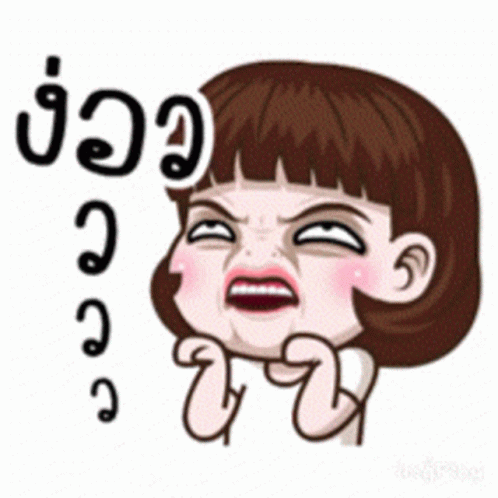 Cute cartoon girl makes funny, exaggerated faces, then looks sleepy with Thai text.