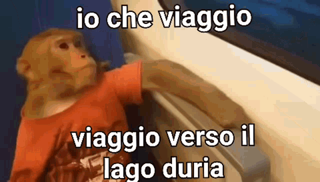 Monkey in a red shirt traveling on a train, looking out the window, heading towards Lake Duria.