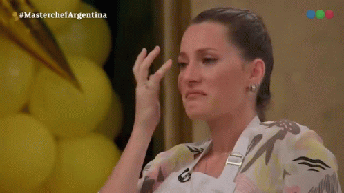 Mica Viciconte wipes away tears during an emotional moment on Masterchef Argentina, surrounded by yellow balloons.