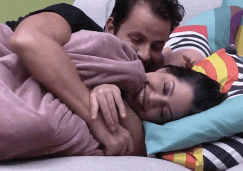 Laís and Gustavo share a sweet, intimate moment, cuddling under a blanket.