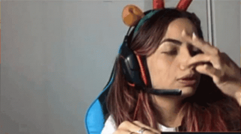 Laixx Sakura, wearing headphones and a horned headband, adjusts her nose while looking at the camera.