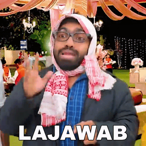 Vibhu Varshney, wearing glasses and a scarf, enthusiastically says 'Lajawab' (Superb).