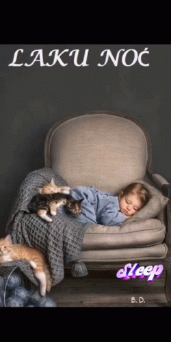 A little girl peacefully sleeping in a cozy armchair, surrounded by two adorable cats.