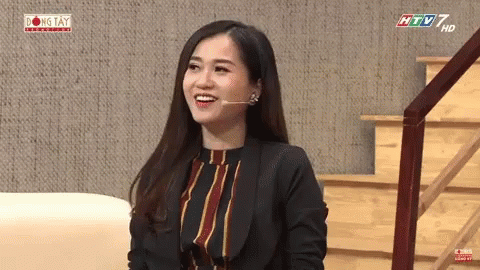 Lâm Vỹ Dạ smiling and laughing, wearing a striped shirt and blazer, on a set with HTV7 HD logo.