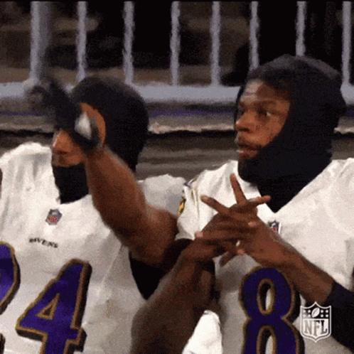 Lamar Jackson and Baltimore Ravens players react with excitement on the sidelines during a game.