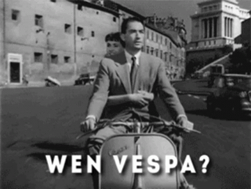 A man in a suit rides a scooter with a woman, featuring the meme text 'WEN VESPA?' from the movie Roman Holiday.