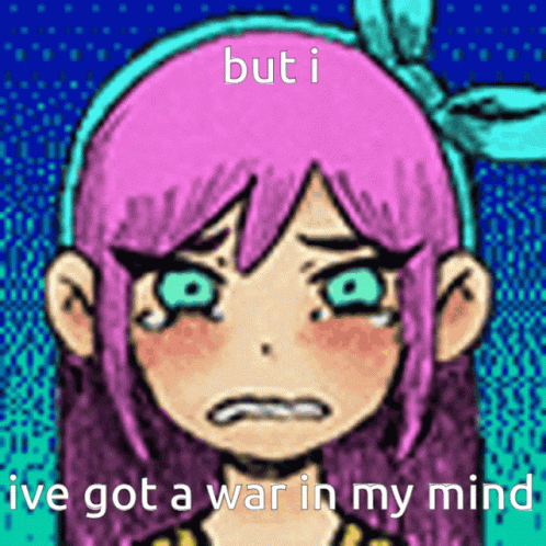 A crying cartoon girl with pink hair, referencing Lana Del Ray's 'Ride Or Die' with the text 'but i ive got a war in my mind'.