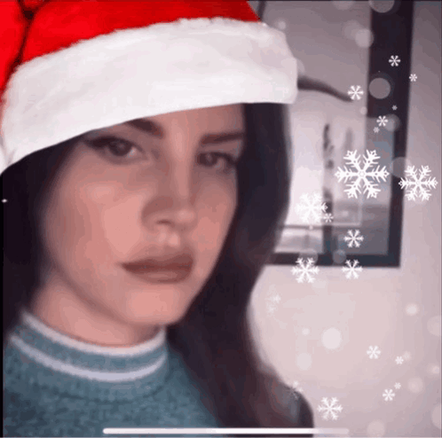 Lana Del Rey looking festive in a Santa hat with falling snowflakes in the background.