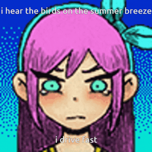 Cartoon girl with pink hair, inspired by Lana Del Rey, hears summer breeze and drives fast.