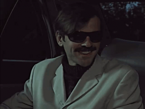 Лапенко, wearing dark sunglasses and a light jacket, smiles broadly while sitting in a car at night.