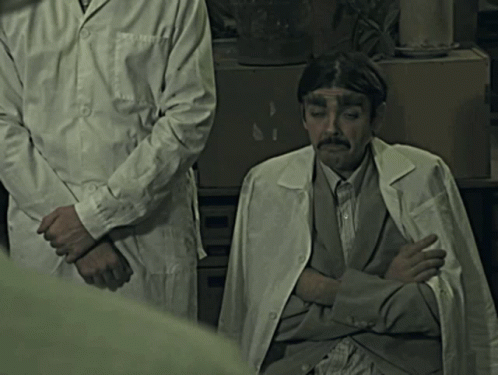 Lapenko's character, with exaggerated eyebrows and mustache, gestures while wearing a lab coat.