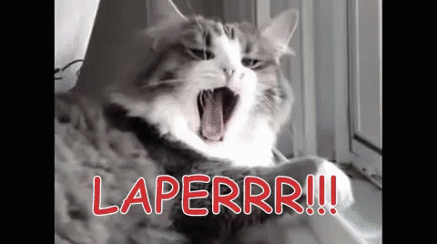 A sleepy cat yawns widely, with the text 'HUNGRY!!!' displayed, expressing its intense hunger.