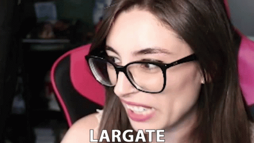 Lyna, wearing glasses, makes a funny and exaggerated face, with the word 'Largate' displayed.