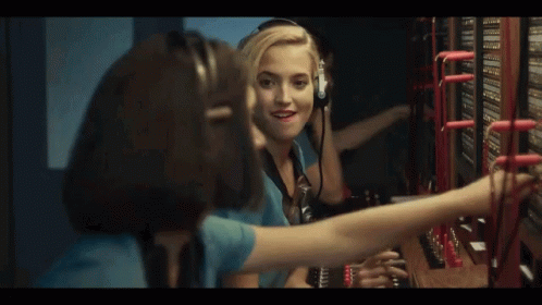 Two women from 'Las Chicas Del Cable' working as telephone operators in a vintage switchboard room.