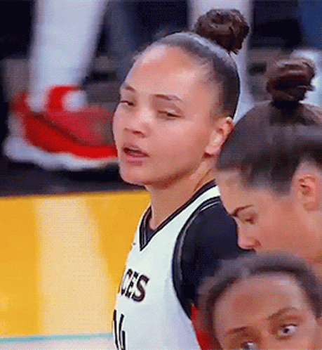Destiny Slocum of the Las Vegas Aces basketball team smiling on the court in her jersey.