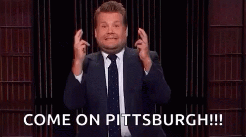 James Corden from the Late Late Show anxiously crosses his fingers, exclaiming 'Come on Pittsburgh!!!' with a hopeful expression.