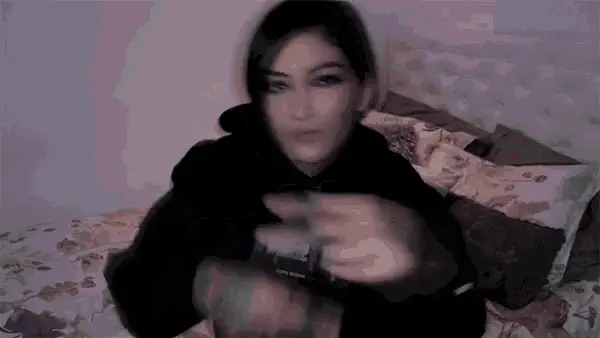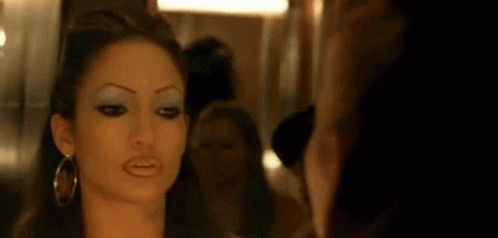 A Latina Chola with distinctive makeup and a bandana looks intently at her reflection in a mirror.