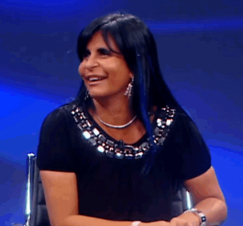 Brazilian singer and media personality Gretchen laughs heartily while sitting in front of a blue background.
