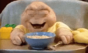 Baby Sinclair from Dinosaurs TV show laughs heartily while sitting in a high chair with a bowl of cereal.
