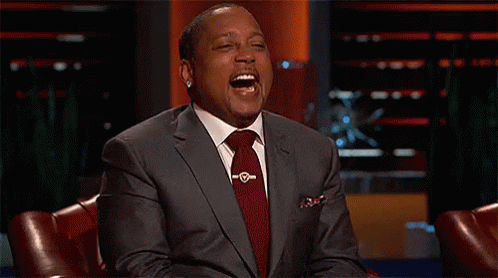 Daymond John from Shark Tank laughing heartily in a suit and tie.