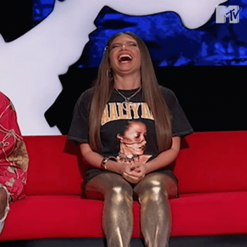 Chanel West Coast bursts into laughter while sitting on a red couch during an MTV show.