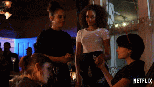 Kiana Madeira and Quintessa Swindell share a laugh and hold hands at a gathering, joined by Moe Truax and Tabitha Foster.