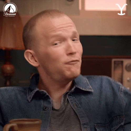 Jefferson White as Jimmy Hurdstrom from Yellowstone, wearing a denim shirt and laughing heartily.