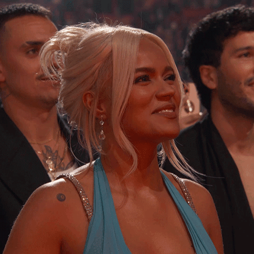 Karol G is seen laughing and smiling brightly at the Latin Grammys, wearing a stunning blue dress.