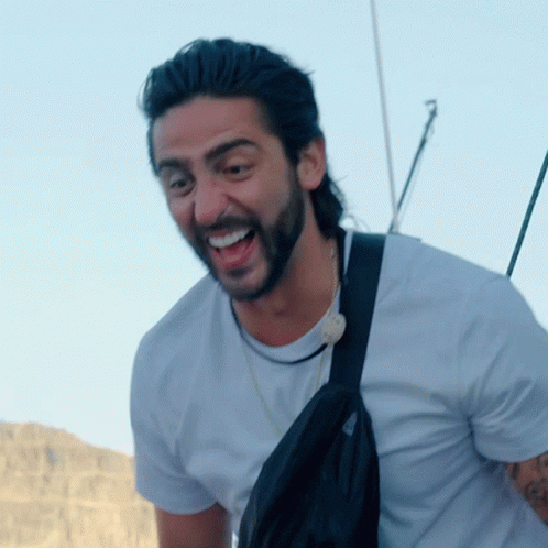 Luis Caballero laughing heartily on All Star Shore, wearing a white shirt and a black bag. A hilarious moment from S1E2.