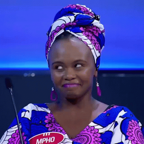 Mpho, wearing a headscarf, laughs heartily during an episode of Steve Harvey's Family Feud South Africa.