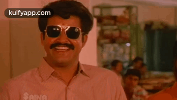 Mohanlal, wearing sunglasses and a mustache, shares a hearty laugh, bringing joy and humor.