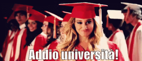 Woman in graduation cap and gown celebrates finishing university with 'Addio università!' caption.