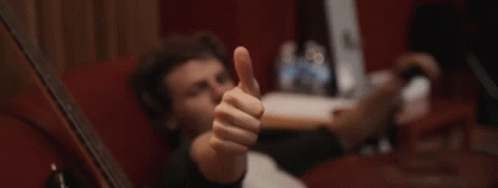 Lawson Joel Peat gives a confident thumbs up while relaxing on a red couch.