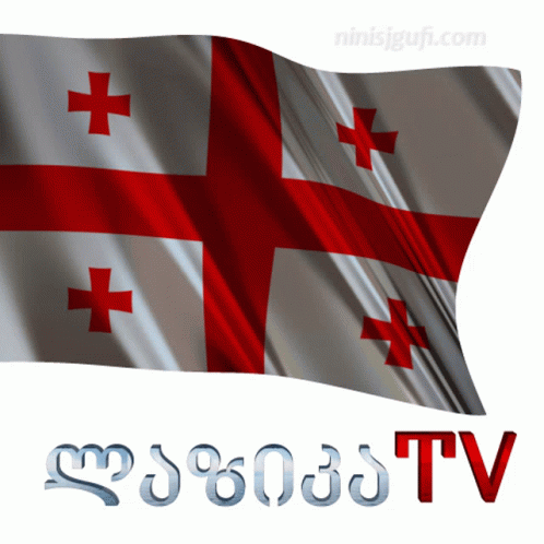 The national flag of Georgia, featuring a red cross on a white background, waving with 'Lazika TV' and 'Ninis Group' branding.
