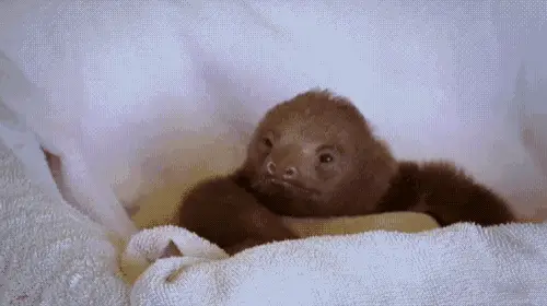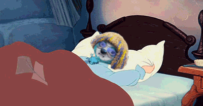 A cartoon sloth-like character with glasses and a wig slowly wakes up in a cozy bed, covered by a red blanket.